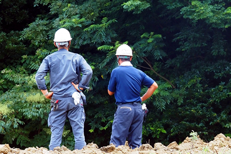 苗木を山に植栽(植え付け)する前には、苗木の生育環境をよくするため、雑草や灌木などを取り除く「地拵え」という整地作業をします。地拵えは林業の中でも大変な作業ですが、気を育てる過程の中で最初に行う重要な仕事です。